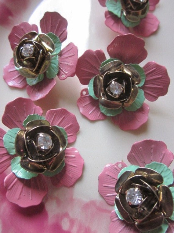 Multilayer metal enameled flowers with a rhinestone center headpin. The flower starts with a plated rose shape center and has green and pink flowers layered to create this wonderful element for jewelry. At the top of the pink flower the is a hole to hang this piece from.