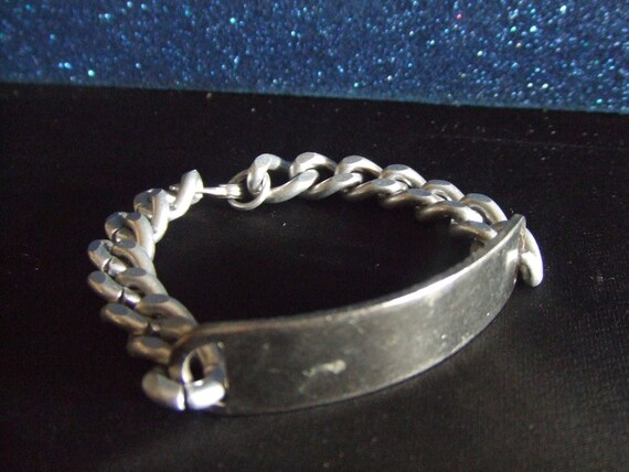Leichte Vintage Silvertone ID Armband. W/Aluminiumlegierung Id Platte hinzugefügt. Keine Gravuren oder Stempel auf beiden Seiten. 7 1/4 "Länge & 1/2" in der Breite misst. 17 Gramm wiegt. Kettenglieder in einwandfreiem Zustand, Id-Platte hat einen kleinen Fleck von Rost auf Rücken & eine kleine Scheuer-auf der Vorderseite (siehe Pix). Insgesamt gut in Form. Verkauft, wie Sie ist.