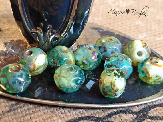 They are a beautiful transparent green in various hues that have what is called a picasso finish in browns and creams that makes the beads look rich with a two tone finish.
