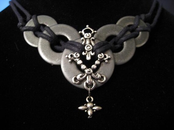 This artifact contains - five matched gunmetal gray washers in graduated sizes from the Habitat for Humanity ReStore salvage effort in Kalamazoo, Michigan; a very fancy silver-colored filigree jewelry component. Cord length is 7", focal piece measures 3" across, total length of necklace is 16" unclasped.